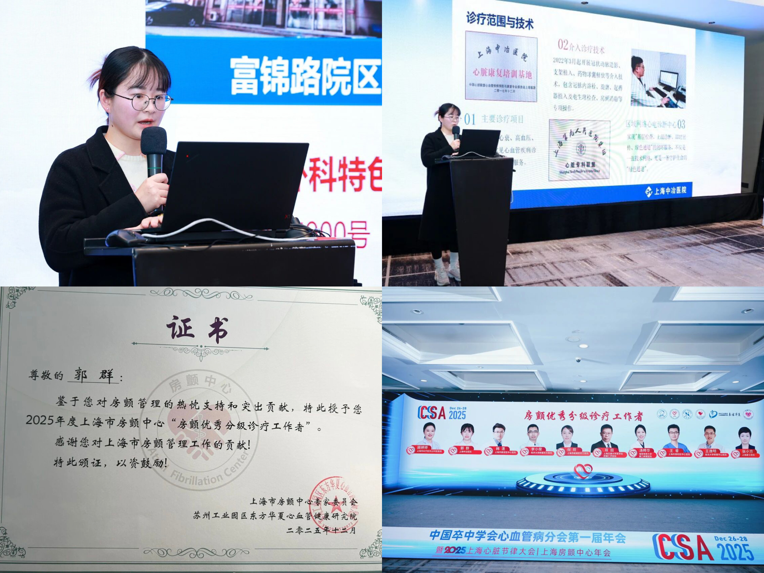 此外,郭群因在房颤分级诊疗工作中所表现出的高度责任感、积极投入和显著工作成效,被大会授予2025年度上海市房颤中心“房颤优秀分级诊疗工作者”荣誉称号。