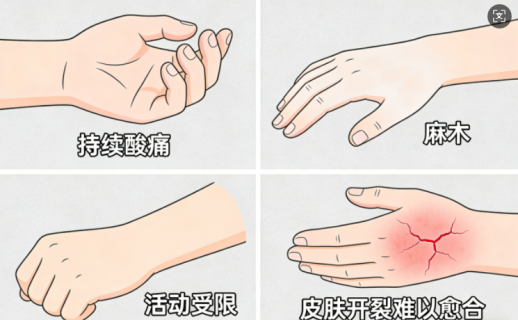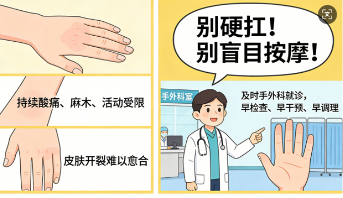 若手部出现持续酸痛、麻木、活动受限,或皮肤开裂难以愈合等情况,千万别硬扛,也不要盲目按摩揉搓,及时前往医院手外科就诊,早检查、早干预、早调理,避免小不适发展为慢性损伤,影响手部功能。