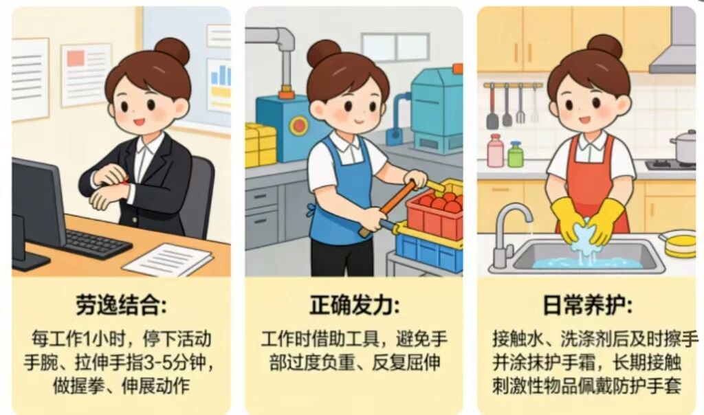 2.正确发力:工作时学会借助工具,避免手部过度负重、反复屈伸,减少手腕和手指的压力。