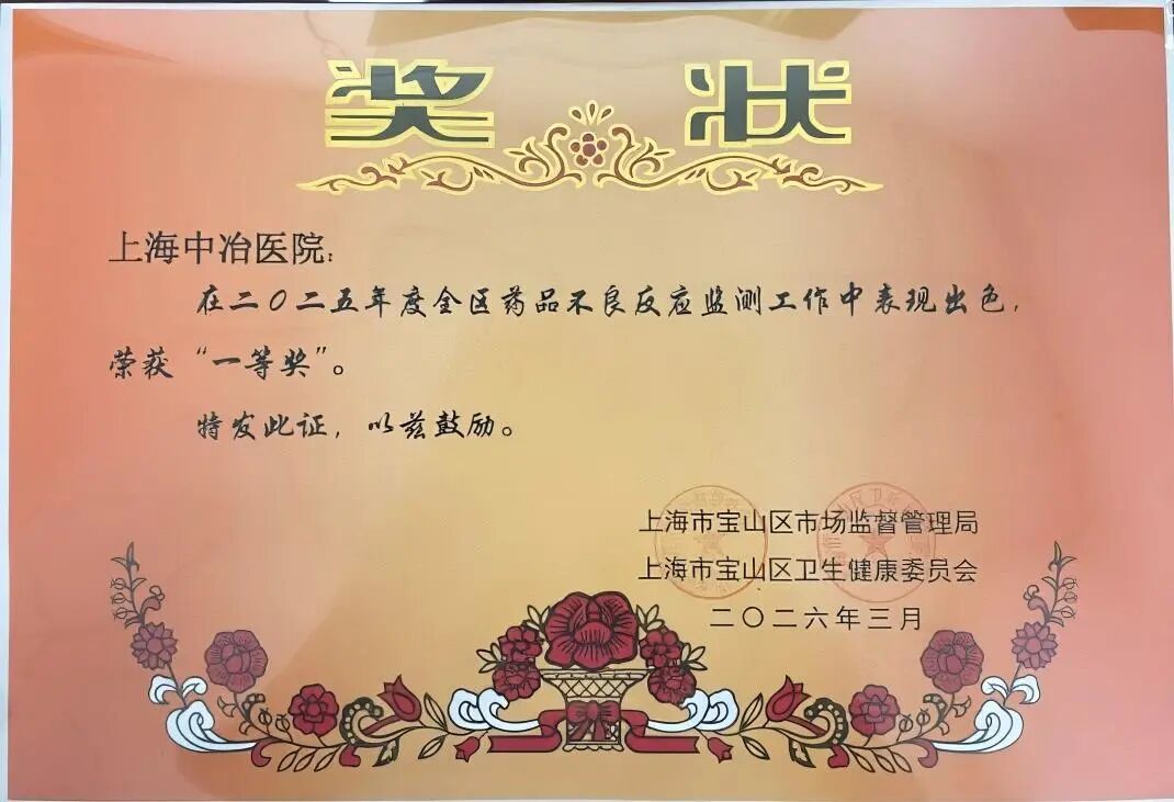 3月30日,宝山区市场监督管理局、宝山区卫生健康委员会联合召开2026年药品化妆品不良反应/医疗器械不良事件监测工作大会,发布《关于表彰2025年度药品不良反应监测等工作先进单位和优秀个人的决定》。上海中冶医院凭借扎实的工作成效,荣获宝山区2025年度药品不良反应监测优秀单位“一等奖”。