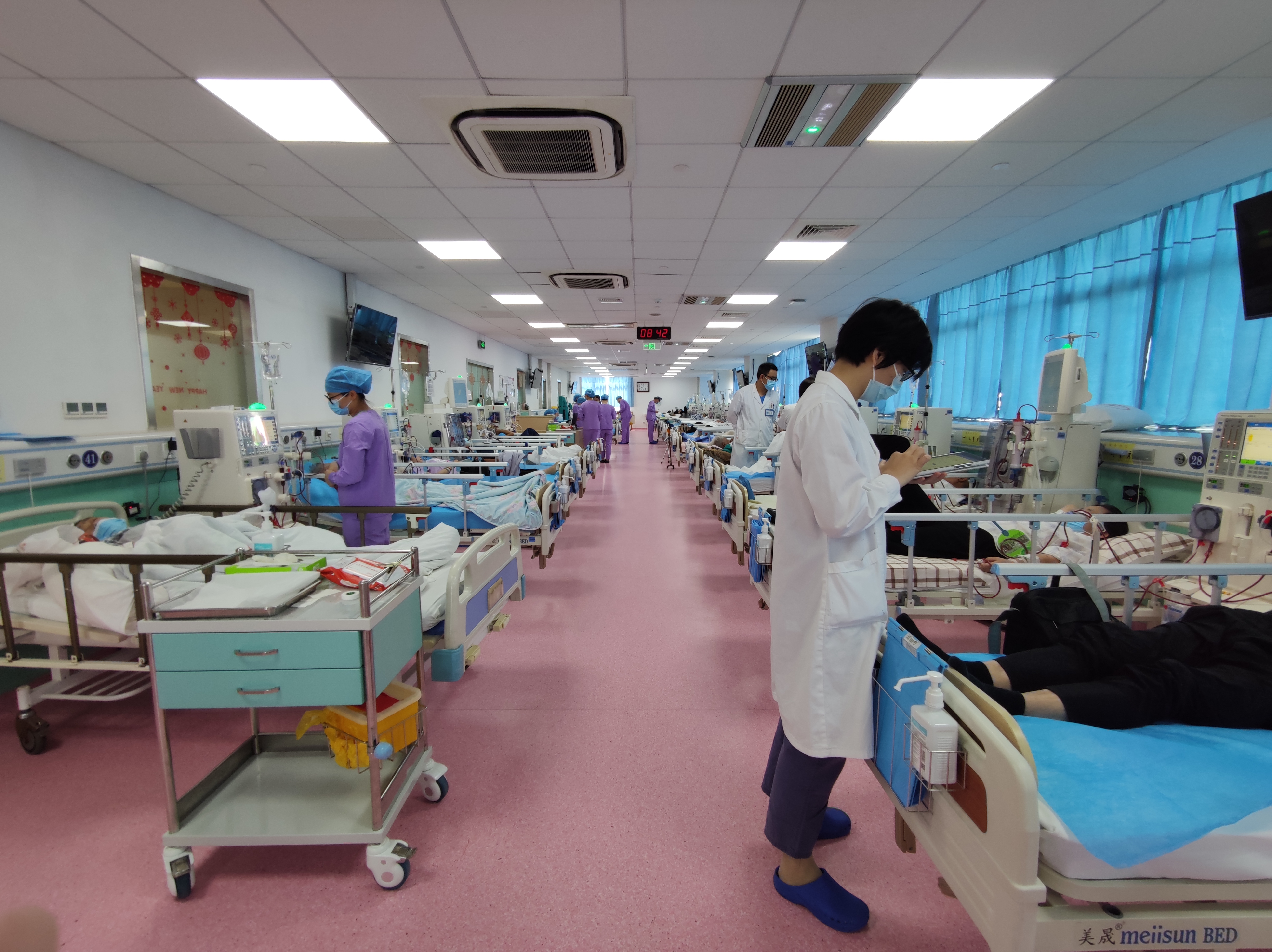 开放透析床位42张,每个透析单元均配备功能齐全的透析系统,同步提供中心供氧、负压吸引等基础保障。核心设备包括:24台德国费森4008 V10单泵透析机、16台费森5008S双泵透析机、4台百特ARITIS血滤机、1套费森双极返渗水处理系统,以及7台CRRT机;同时配备B超仪、人体成分分析仪、除颤仪、心电监护仪等专业设备,为危重患者抢救提供坚实硬件支撑。